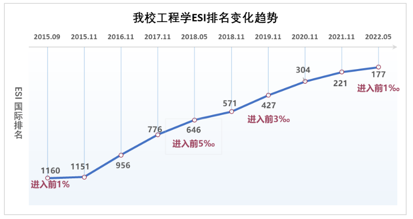 学校一直努力建设顶尖学科。工程学于2015年9月率先进入全球前1%,2018年5月进入全球前5‰,2019年11月进入全球前3‰,经过近7年的努力,本次成为学校第一个ESI全球前1‰学科(全球排位0.92‰),也是深圳本土高校第一个ESI全球前1‰学科。全球有192个机构进入ESI工程学前1‰,深大位居177位;国内有49所高校进入ESI工程学前1‰,深大位居48位。