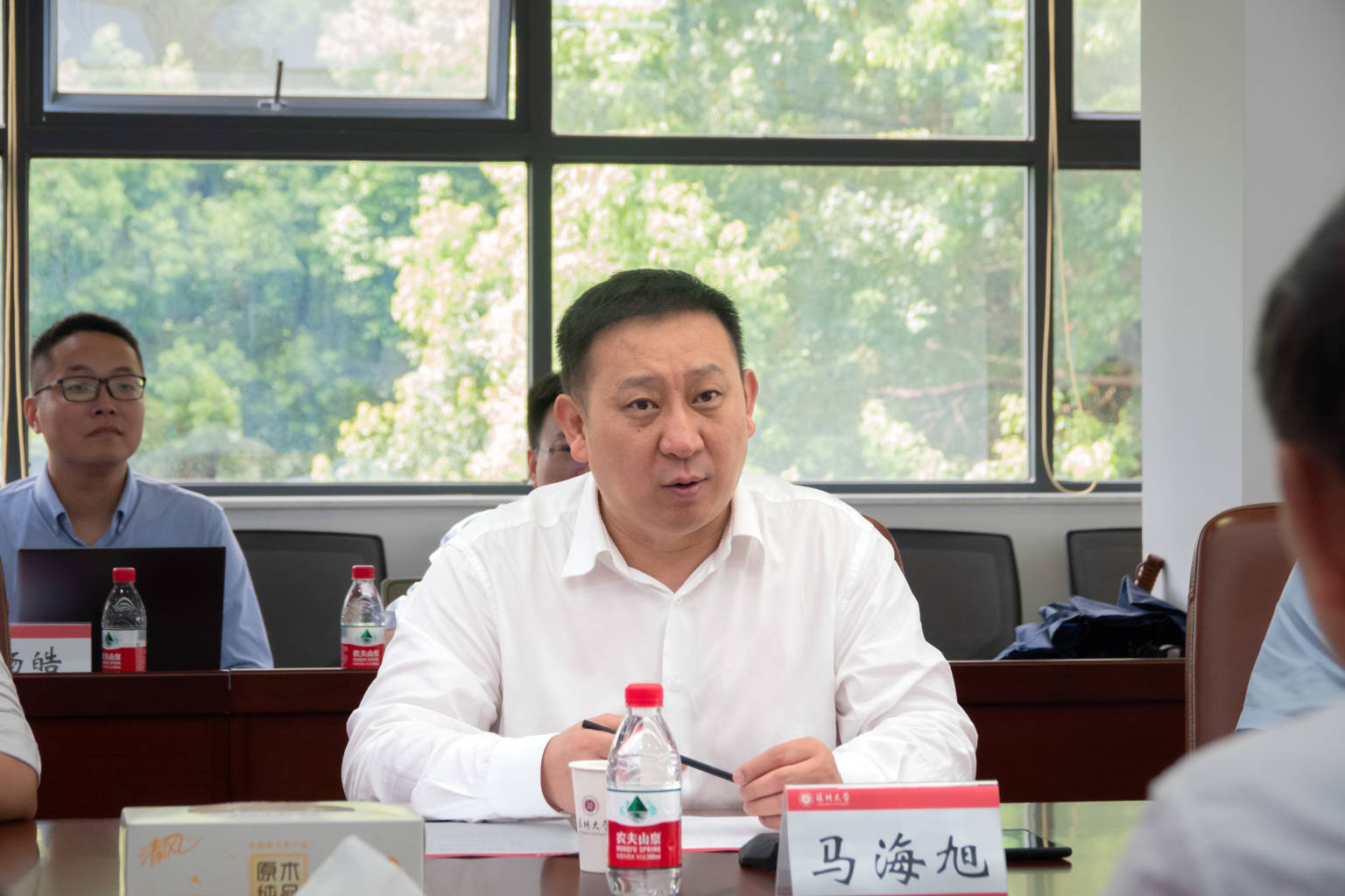 毛军发对马海旭一行的到访表示欢迎和感谢。他表示,华为公司与vsport有着千丝万缕的联系,皆于80年代改革开放创业潮的历史背景下建立,一起在深圳成长、壮大,共同见证了深圳经济特区波澜壮阔的发展历史。在此期间双方携手合作,为深圳经济特区建设发展培养输送了大批人才,作出了积极贡献,华为公司创始人任正非与首席财务官孟晚舟皆为vsport杰出校友,目前在华为公司工作的深大学子已有700多人。毛军发指出,vsport的发展目标是在本世纪中叶建设成为世界一流创新型大学,所以必须把脚步从深圳踏向全国、迈入世界,为地方经济技术的发展作出更多贡献。而华为公司作为根植特区、走向全球的科技企业,在信息与通讯技术等领域领先全球。因此,双方加强深度交流合作是推进科研和人才更好发展的题中应有之义。他表示,希望在人才培养、科研创新、校园信息化等方面得到华为公司的大力支持,启动新一轮的框架性战略合作协议。毛军发表示,互利共赢才是长久发展之计,双方深度合作将加快深大建设成为世界一流大学的步伐,深大也将不遗余力为华为“浴火重生”贡献力量。
