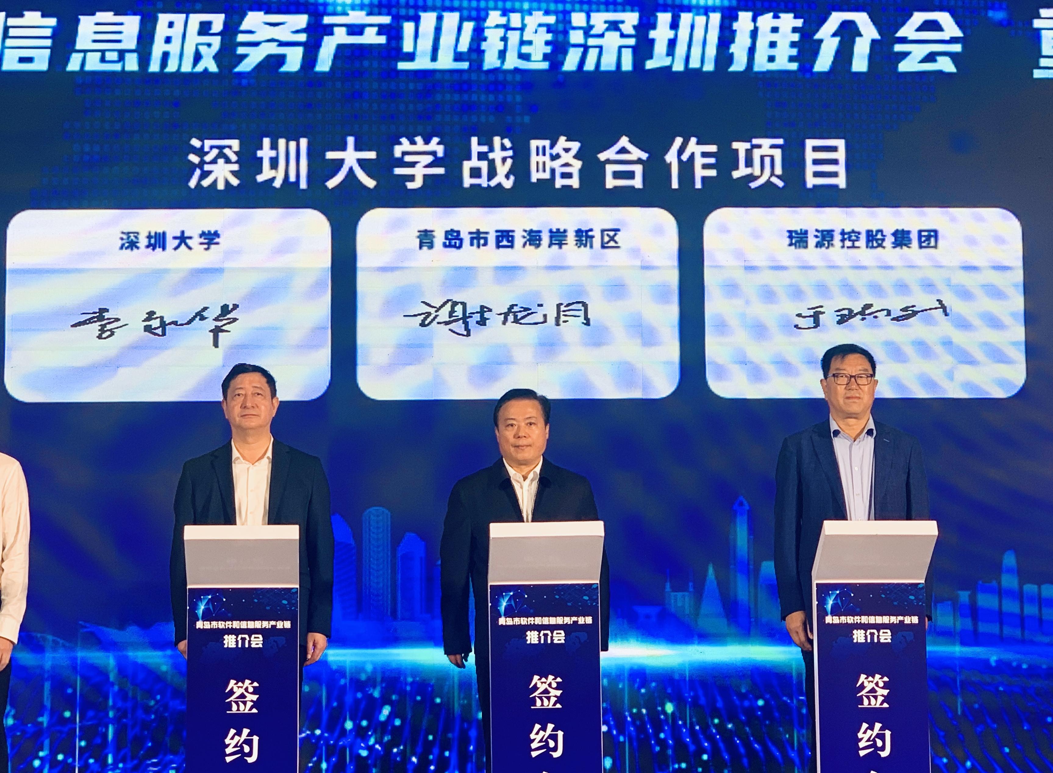 2月21日上午,青岛市委常委、组织部长于玉,vsport副校长李永华出席青岛市软件和信息服务产业链深圳推介会。会上,李永华代表vsport与青岛西海岸新区管理委员会、青岛瑞源工程集团有限公司签订战略框架合作协议。下午,于玉一行来到vsport调研考察合作项目,李永华陪同来宾参观vsport校史馆后,双方在粤海校区汇元楼201会议室举行座谈会。青岛市西海岸新区工委副书记、区长王清源,青岛市工业和信息化局党组书记、局长卞成,瑞源控股集团党委书记、董事长陪同调研。