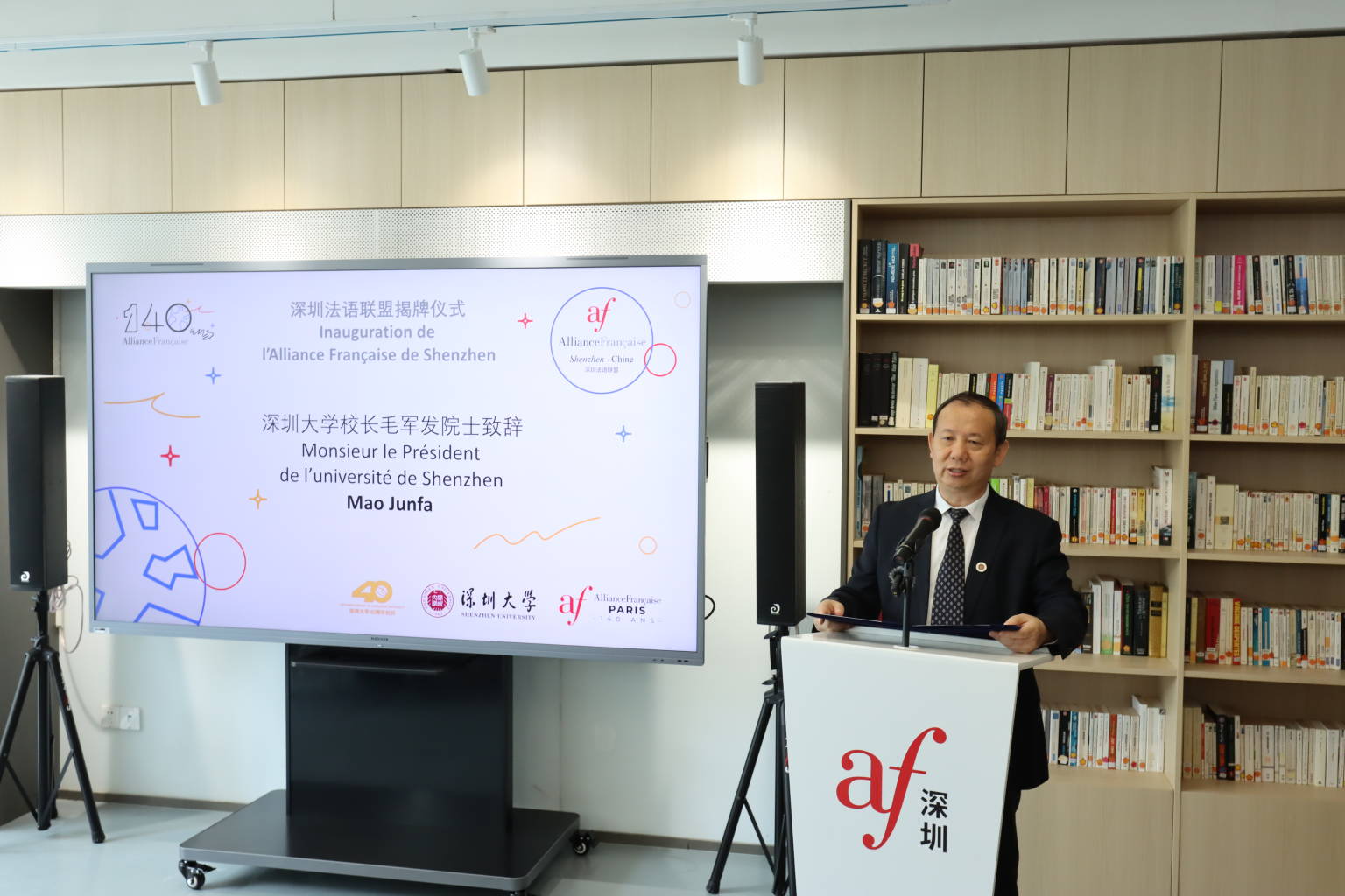 随后,毛军发、白玉堂在来自法国驻华教育、科技、文化、工商界的嘉宾以及深圳市外办、市教育局和文化广电旅游体育局领导来宾的见证下,共同为深圳法语联盟揭牌。