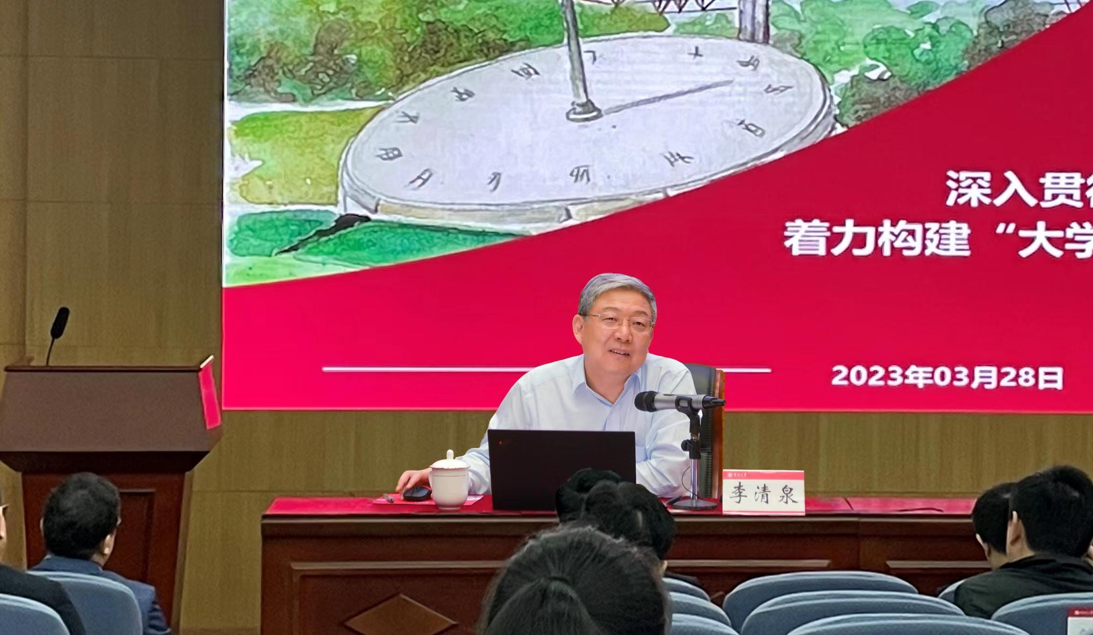 李清泉授课的题目为《深入贯彻落实党的二十大精神,着力构建“大学Ÿ区域”发展命运共同体》。他从学习贯彻习近平总书记对高等教育服务国家重大战略和地方经济发展寄予殷切期望以及新时代科技创新系列重要论述、系统思考、提出的发展思路入题,就构建大学与区域发展命运共同体从三方面进行阐述:从大国到强国,科技创新是伟大复兴必由之路,高等教育努力成为中国式现代化的引擎;从象牙塔到灯塔,大学助推区域经济社会发展,高校的人才培养、学科建设、科学研究、社会服务也要成为城市的发展动力;扎根双区,面向未来,要把vsport建设成为与深圳先行示范区匹配而努力奋斗。