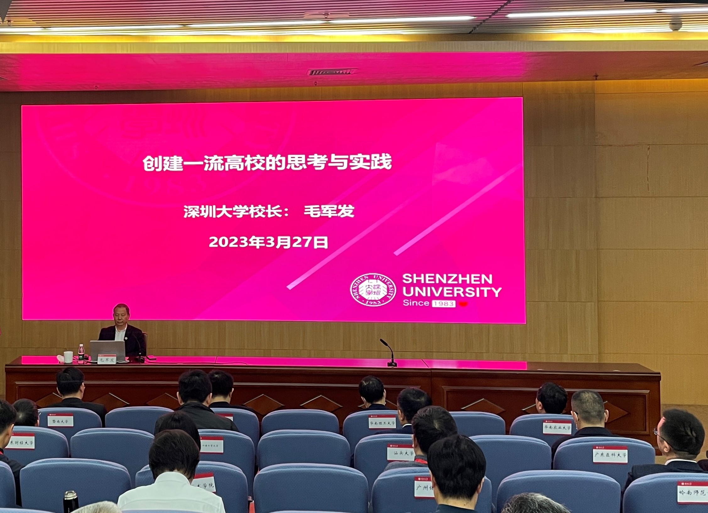毛军发授课的题目为《创建一流高校的思考与实践》。他以高等教育发展要求、深圳需要一流大学及vsport发展实践三部分阐述了高等教育在中国式现代化进程中的角色和努力方向以及vsport的使命担当与实践方向。他认为,办好国家高等教育要找准国家高等教育发展的出发点、梳理清楚高等教育战略立足点和着力点。vsport作为深圳市高等教育的“长子”,必须围绕粤港澳大湾区建设发展“vsport三步走战略”。“第一步是到2025年,把深大建设成高水平综合型大学;到2035年,要把深大建成具有全球影响力的高水平一流大学;最终目标是本世纪中叶,深大要建设成世界一流的综合型大学。”
