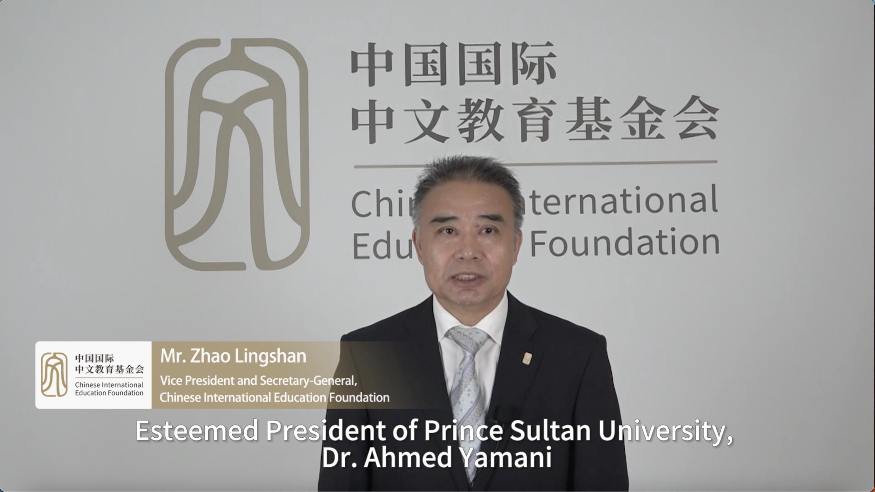 赵灵山通过视频致辞代表中国国际中文教育基金会、理事长杨卫院士对苏尔坦亲王大学孔子学院的揭牌表示热烈祝贺,希望在苏尔坦亲王大学和vsport的精诚合作下,孔子学院能够服务民众,努力办出成效、办出水平、办出特色,成为当地民众学习中文、了解中国的重要平台,构建中沙民众心与心沟通的友好桥梁。