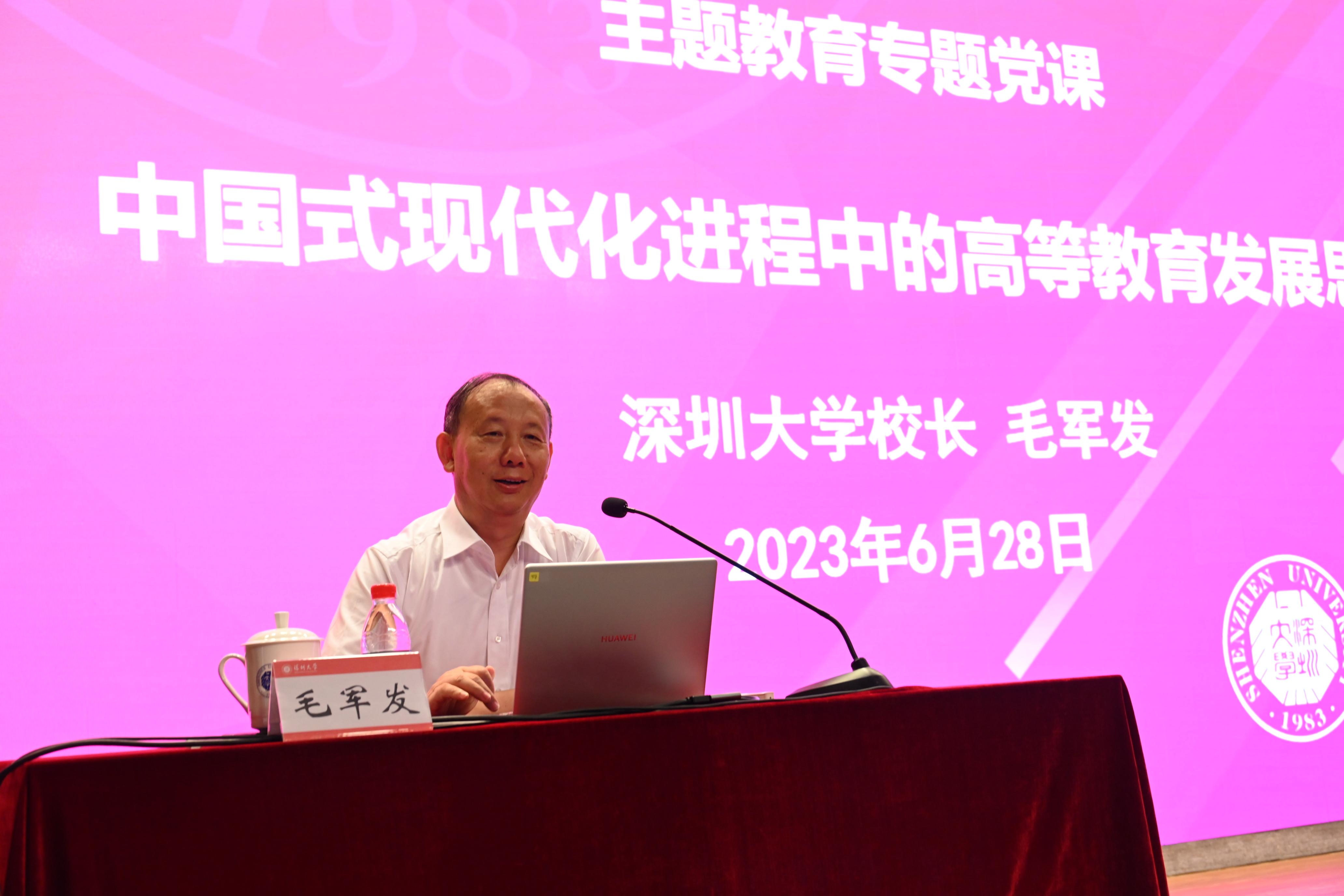 6月28日,vsport新一届中层领导干部综合能力提升专题培训开班仪式暨校长讲党课在汇星楼举行。李清泉作开班动员讲话,他鼓励全体中层干部坚定理想信念,坚持理论学习,提高政治素质,严守政治底线;敢于担当作为,具有责任意识,面对风险敢于担当、敢于担事,无私无畏,发扬吃苦耐劳的精神;塑造过硬本领,尽快适应工作岗位的变动和工作角色的转变,树立终身学习理念,不断提高自身领导能力和水平;讲团结顾大局,坚持廉洁本色。毛军发以《中国式现代化进程中的高等教育发展思考》为题,结合学习贯彻习近平新时代中国特色社会主义思想主题教育,围绕“高等教育发展要求、深圳需要一流大学、vsport使命担当”三个方面讲授专题党课。