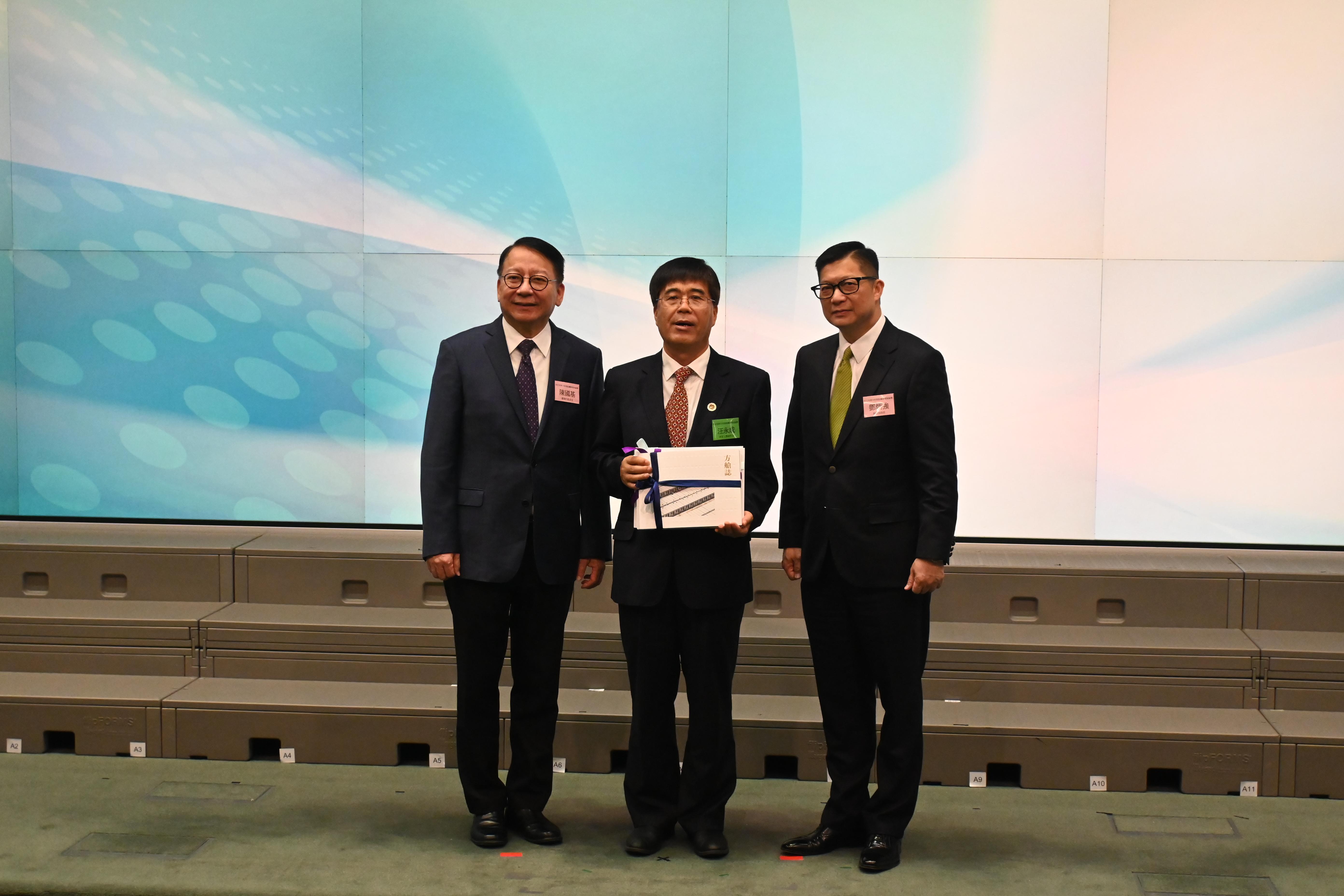 香港保安局局长邓炳强表示,论坛学员在圆满完成一年的学习后取得了明显的成长和进步,有学员获推荐代表香港出席联合国毒品和犯罪问题办公室2024年度青年论坛的候选人、有成员获得内地创科龙头企业的实习机会、还有成员成功加入纪律部队,他期望学员们无论在任何岗位都继续发挥领袖角色,为国家和香港作出贡献。同时,他对vsport的大力支持表示衷心感谢,并希望接下来与深大签署合作备忘录后,双方进一步加强合作,深化学员的学习和交流,更好地培育青少年。邓炳强与汪永成一同为论坛最佳队伍颁奖,双方交换了纪念品。