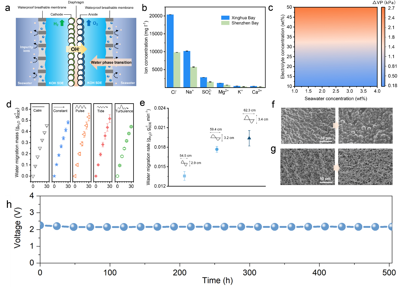 针对前述挑战,谢和平院士团队通过将分子扩散、界面相平衡等物理力学过程与电化学反应结合,开创了海水原位直接电解制氢全新原理与技术(Nature, 2022, 612(7941): 673-678.),建立了气液界面相变自迁移自驱动的海水直接电解制氢理论方法,形成了界面压力差海水自发相变传质的力学驱动机制,实现了无额外能耗的电化学反应协同海水迁移的动态自调节稳定海水直接电解制氢。自主研制的386 L/h H2原理样机在深圳湾海水中稳定制氢超3200小时,全面解决了多年困扰科技界和产业界的难题;完美破解了海水电解制氢领域的半世纪难题,实现了把取之不尽的海水当纯水一样直接用于电解制氢。该技术被评为2022年中国科学十大进展。