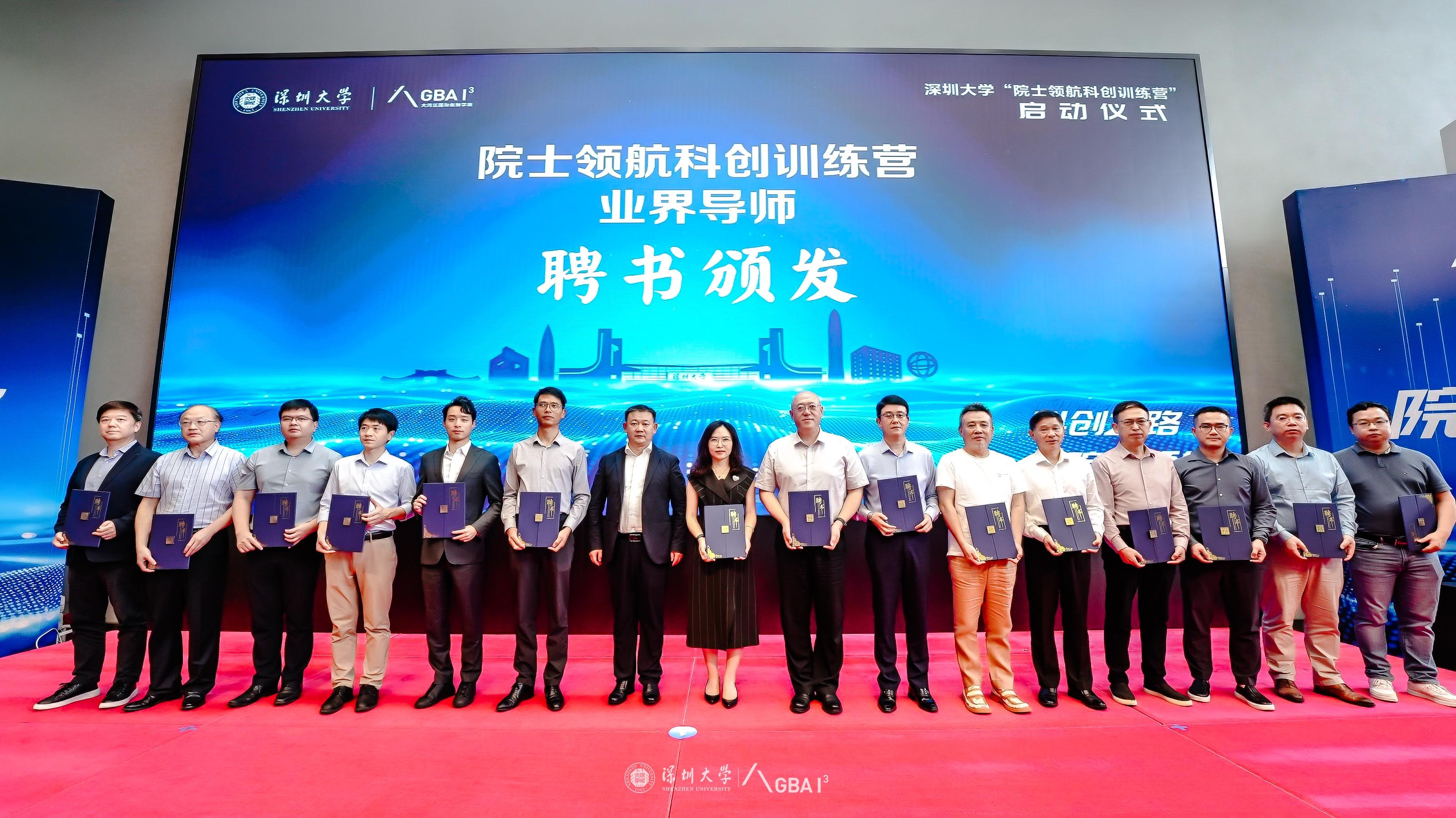 此外,训练营还聘请来自腾讯集团、华为公司、北京万学教育科技有限公司、深圳创新投资集团有限公司、深圳市计量质量检测研究院、深圳市力合科创股份有限公司、深圳市智绘科技有限公司、深重投、机场集团、交易集团、影石、信德资本集团、深圳市乐土南科基因药物有限公司、搏实资本、深圳市声光行科技发展有限公司的多位业界和投资界专家担任校外导师。王汝津为他们颁发聘书。
