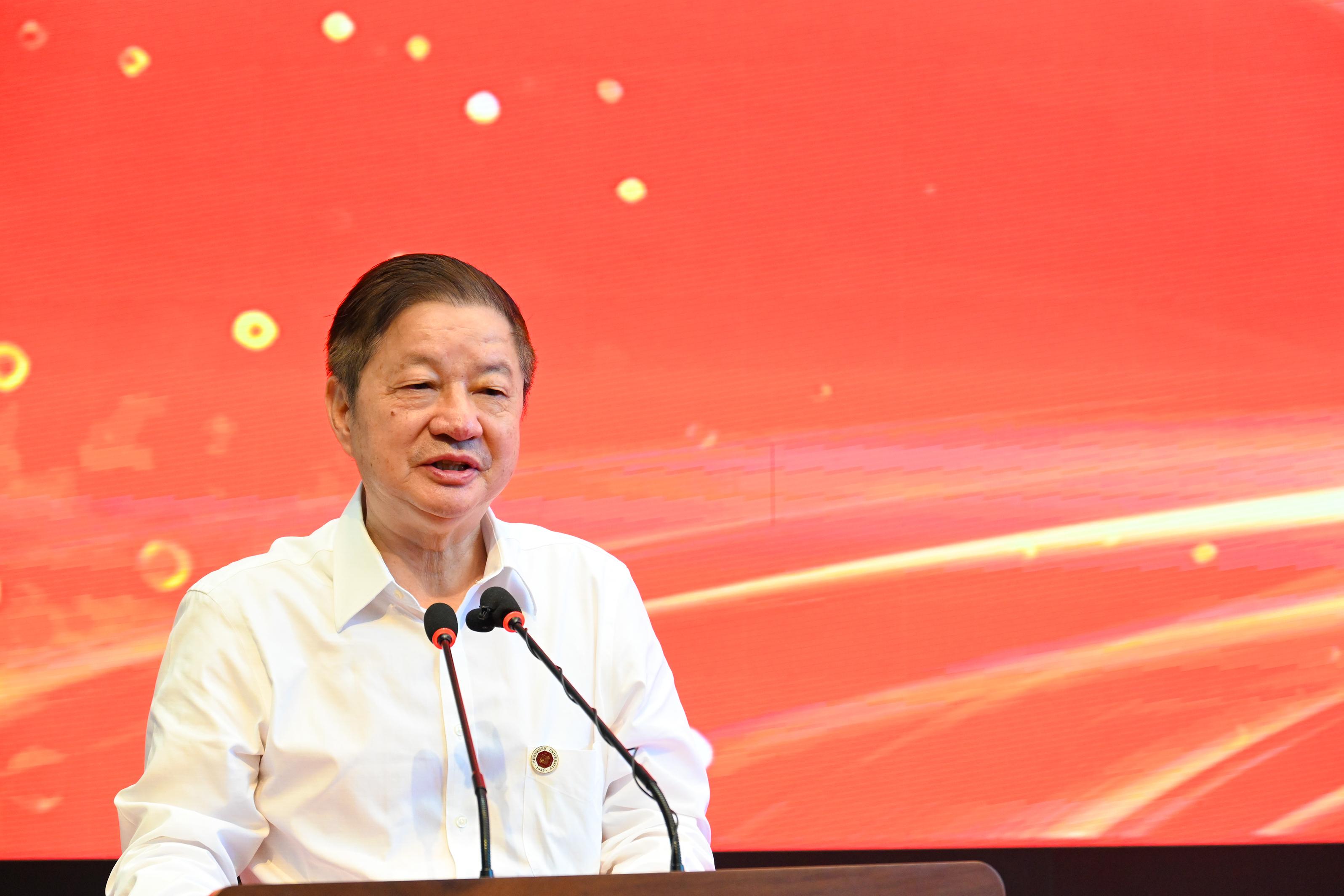 毛军发宣读表彰决定并在大会上致辞。他代表学校向全体受表彰教师表示祝贺,向全体教职员工以及为学校发展做出重要贡献的老领导、老同志、老教师致以节日的祝福和亲切的问候。毛军发指出,在过去一年,深大全体教师踔厉奋发、攻坚克难,推动学校取得了许多突破性进展,学科实力不断增强,高水平国际化人才队伍建设迈上新台阶,新建的四个“院士班”打造了创新培养人才的新载体,3人获颁2023年度国家科学技术奖,香港学院首年招生且反响热烈。近年来,学校围绕“十四五”规划目标,立足国家重大战略和“双区”发展需求,进行“激发活力的师资队伍制度建设”,把教师队伍建设作为创建一流大学的核心支撑。今年,学校成立了党委教师工作委员会,统筹开展教师激励工作,设立了多个首次评选的荣誉称号,健全教师荣誉表彰体系;建立了首个推优评先人才库,加大先进事迹的挖掘和宣传,评选出了一批优秀典型。