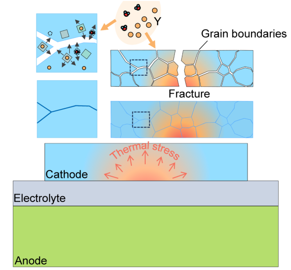 该研究首次从电极体相断裂力学强化的视角出发,通过力学与电化学的深度交叉研究,成功提出了一种通过化学水合调控力学性质的新策略,不仅有助于提升固体氧化物燃料电池、质子陶瓷燃料电池、直接煤燃料电池等一系列燃料电池的力学耐久性,还为电池、催化、高温电化学能源转换器件等领域的材料力学优化提供了崭新思路,为清洁能源技术的突破和产业化应用提供助力。