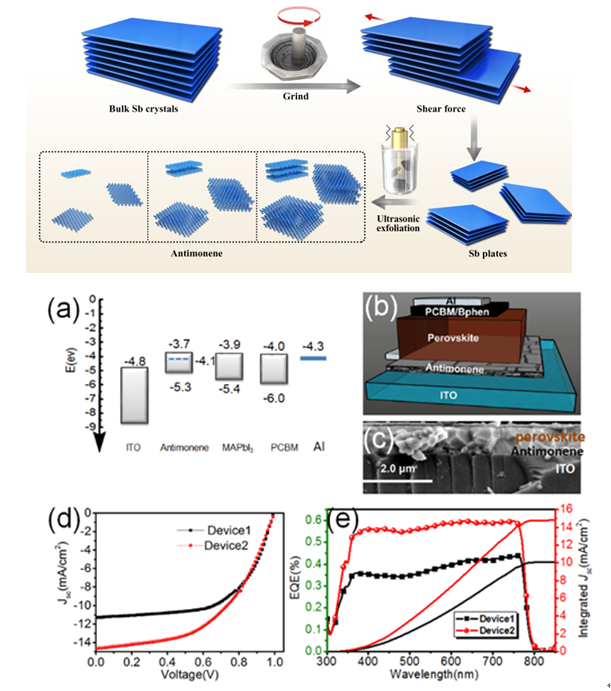 锑烯(Antimonene)因具有独特的电子和光学性质而成为一种受到广泛关注的新型二维材料,然而目前对其光电特性的研究还仅存在于理论研究阶段。近期课题组基于液相剥离法成功制备出表面光滑的大尺寸二维锑烯,并通过有效分离技术获得不同层数的锑烯材料,实现了带隙在0.8~1.44eV的精准调控。在实际应用方面,首次将锑烯作为钙钛矿太阳能电池的空穴传输层,并表现出较强的空穴提取能力和电流增强性能。该研究作为最早对锑烯半导体特性的实验工作,有望在光电子器件等方面获得广泛应用。