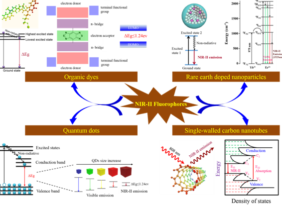 荧光成像主要依靠荧光探针标记技术跟踪观察生物组织和细胞中感兴趣区域的变化信息。荧光成像不仅快捷简便,无辐射损伤,而且灵敏度高,能够实现病变组织的早期诊断和实时成像。按成像波长,主要分为可见光成像(400-700nm),近红外一区成像(700-1000nm)和近红外二区成像(1000-1400nm和1500-1700nm)。与可见光和近红外一区相比,近红外二区具有更弱的生物组织吸收和散射作用,更深的穿透深度和更高的信噪比。近年来,近红外二区荧光探针取得了巨大进展,主要包括(附图):有机染料分子(organic dyes),稀土掺杂纳米颗粒(rare earth doped nanoparticles), 量子点(quantum dots)和单壁碳纳米管(single-walled carbon nanotubes)。另外,光电探测及成像技术的发展,也为近红外二区成像的发展和应用奠定了基础。本课题组在前期工作的基础上,系统总结了各种近红外二区荧光探针的发光机理与制备方法,详细介绍了其在生物成像、疾病诊疗中的应用,并讨论了近红外二区荧光探针的设计与构建的基本策略以及它们在临床转化应用中所面临的机遇和挑战。