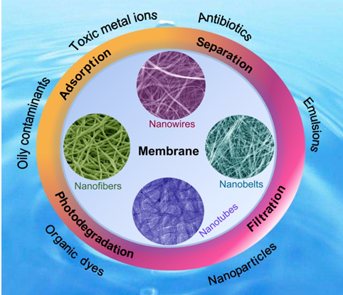 本文概述了一维纳米材料包括纳米线、纳米带、纳米管、纳米纤维等组装的宏观薄膜材料用于污水处理。从吸附、分离、过滤及催化等四种功能上介绍了此类膜材料在去除油污、重金属离子、抗生素、染料、乳液、纳米颗粒等方面的优势,并系统阐述了膜材料的结构、组分、表面浸润性等因素在相应功能展现上的重要性。另外,本文对水处理的未来发展方向与面临的挑战做出了前瞻性展望和深入的思考。