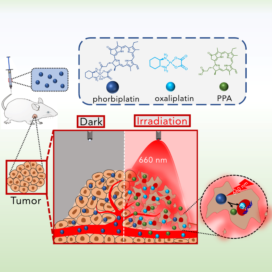 化疗依然是临床上治疗癌症的重要手段之一。大部分化疗药物由于缺少对肿瘤组织的选择性,杀死肿瘤细胞的同时也对正常组织产生毒副作用。因此,实现化疗药物在肿瘤组织中选择性激活从而降低化疗的毒副作用具有重要的临床价值。一种极具有潜力的解决化疗药物毒副作用的药物设计思路是制备光可控激活的前药。这类药物给药后在黑暗环境中稳定,毒性低;针对肿瘤位置进行光照时,肿瘤内的前药迅速活化成活性药,继而杀死肿瘤细胞。此研究中,将对红光响应的卟啉类氧化还原催化剂脱镁叶绿素(pyropheophorbide-a, PPA)引入到惰性的基于奥沙利铂的四价铂前药中得到了首例高效红光可控激活小分子四价铂前药(phorbiplatin)。该前药在生理条件下稳定,化学惰性高,毒性极低。在低强度的红光(650 nm, 7 mW/cm2)照射下,前药迅速还原成活性药奥沙利铂并释放PPA,发挥抗肿瘤活性。进一步对前药的光活化机理进行了深入的研究表明,激发态的PPA从还原剂中得到电子生成还原态的PPA,继而将电子传递给四价铂中心,启动前药的还原过程,这揭示了其独特的光活化机制。最后,团队人员将前药注射到小鼠肿瘤模型中,给药后对小鼠肿瘤进行红光照射。结果表明,与奥沙利铂及奥沙利铂与PPA的混合物相比,该前药具有更强的体内抗肿瘤活性,并且比奥沙利铂和PPA的混合物具有更低的毒性。这项研究首次报道了可以运用到活体内的红光可控激活的铂类前药,为设计光可控激活的四价铂前药提供了一种新的策略,对开发新型可控低毒性的化疗药物具有重要意义。