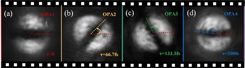 时序图像的拍摄速度/频率主要取决于相邻两个光学延迟线之差。实验上,该系统实现了15万亿幅/秒的有效摄影频率,这创造了高空间分辨相机有效摄影频率的新记录。时间分辨率取决于触发各级OPA和产生闲频光的激光脉冲宽度。本实验该脉冲宽度为50fs(五千万分之一纳秒)。结合超高的摄影频率,该系统可以观测诸多超快物理现象。该研究团队展示了利用该装置实现对等离子体光栅和旋转速度为10万亿弧度/秒的旋转光场(如图2所示)。
