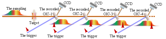 图1成像系统的原理图。采样脉冲(The sampling)照射目标物体,经过4个光学成像转换器(OIC),即非共线光参量放大器。当泵浦光脉冲(标记为“Trigger”)入射OPA时,产生闲频光(标记为“Recorded”)。在泵浦光脉冲之间引入延迟,可以通过使用传统的CCD相机拍摄闲频光来获取时序多幅图像。