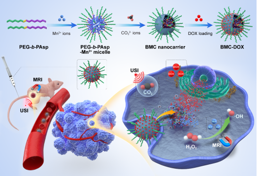 多功能纳米诊疗剂集诊断、治疗、以及疗效监测于一体,可实现个性化的精确诊断和高效治疗。然而,传统纳米诊疗剂通常是通过集成多种功能组分来设计。该策略不仅增加了材料制备过程的复杂性,而且由于各组分在代谢过程中潜在的毒副作用严重阻碍了它们在临床中的应用。为了克服传统多功能纳米诊疗剂存在的缺点,黄鹏教授团队利用聚天冬氨酸(PEG-b-PAsp)为模板,采用原位仿生矿化策略成功制备出碳酸锰矿化的纳米载体(BMC)。该纳米载体具有较高的生物安全性以及肿瘤特异性响应能力,并在酸性肿瘤微环境中分解释放Mn2+离子和CO2气体。其中,释放的Mn2+离子不仅用于肿瘤磁共振成像监测治疗过程,而且通过Mn2+离子介导的化学动力学治疗增强肿瘤治疗效果;释放的CO2气体则用于肿瘤超声成像。此外,BMC对抗癌药物阿霉素(DOX)表现出较高的装载能力以及pH响应的释放特性。体外细胞实验结果表明,DOX负载的BMC对乳腺癌细胞具有较好的杀伤效果,并且体内动物实验也验证了BMC-DOX具有较好的抑瘤效果。因此,这种组成简单且生物可降解的BMC纳米载体,具有肿瘤特异性激活的特点,具有巨大的临床转化前景。