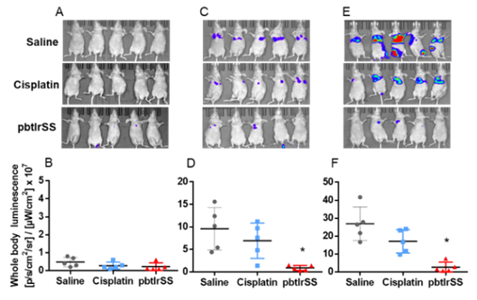 图2.与传统的金属药物顺铂相比含硫金属铱配合物能够显著抑制乳腺癌的肺部转移