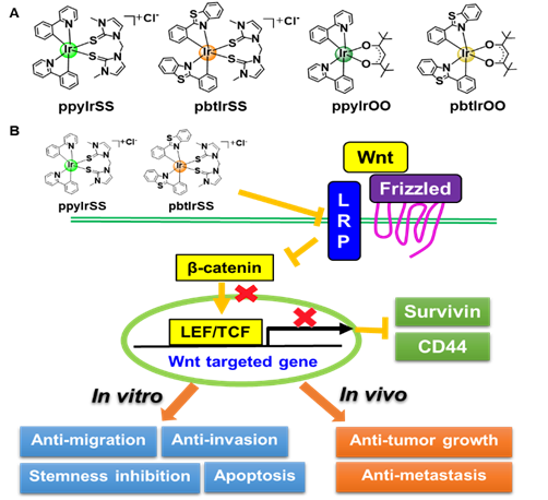 图1.A.金属铱配合物B.含硫金属铱配合物能够通过靶向作用于Wnt/β-catenin信号通路的Wnt共受体LRP6对乳腺癌的发生发展及乳腺癌干性产生抑制作用