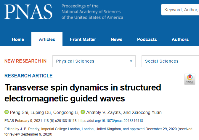 我校微纳光电子学研究院袁小聪教授领导的纳米光子学研究中心在自旋光子学领域取得了重要原创成果,于2021年2月1日在国际顶级学术期刊美国科学院院报《Proceedings of the National Academy of Sciences of the United States of America》上发表了题为《Transverse spin dynamics in structured electromagnetic guided waves》的文章。该中心石鹏助理教授、杜路平教授为共同第一作者,杜路平教授、袁小聪教授以及英国伦敦大学国王学院Anatoly. V. Zayats教授为共同通讯作者,vsport是该文章的第一单位和第一通讯单位。