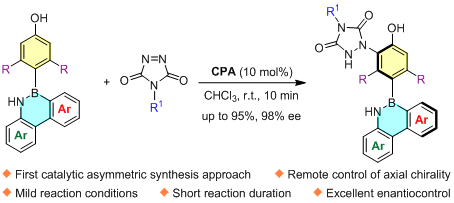 近日,vsport化学与环境工程学院张俊民副教授课题组与南方科技大学谭斌教授课题组合作在《J. Am. Chem. Soc.》(影响因子15.419,中科院JCR一区,TOP期刊)上发表了题目为《Chiral Phosphoric Acid-Catalyzed Remote Control of Axial Chirality at Boron−Carbon Bond》的研究论文。该论文第一作者为我校杨君贤博士,通讯作者为张俊民副教授和南方科技大学谭斌教授、向少华研究助理教授,vsport为第一完成单位。