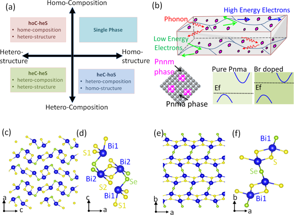 图1 Bi2SeS2的纳米组成和晶体结构示意图。(a)根据纳米复合材料的基体相和纳米析出相的晶体结构和化学组成差异分类的三种纳米复合材料。目前大多数报道的纳米复合材料属于异成份和同结构(heC-hoS)或异成分和异结构(heC-heS)。(b)PnmaBi2SeS2-PnnmBi2SeS2hoC-heS)纳米复合材料内部输运机制的结构和示意图。(c-d)Bi2SeS2Pnma相在ac晶面的晶体结构。(e-f)Bi2SeS2Pnnm相在ab晶面的晶体结构。