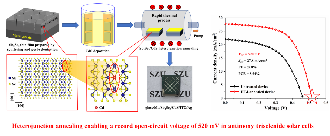 近日,vsport物理与光电工程学院范平教授团队梁广兴研究员在新型硒化锑薄膜太阳电池研究中获得重要进展,在国际材料和物理应用领域顶级期刊Advanced Materials(影响因子:32.086)上发表了题为“Heterojunction Annealing Enabling Record Open-Circuit Voltage in Antimony Triselenide Solar Cells”的研究论文。该论文采用与产业兼容性高的真空溅射结合硒化热处理生长高质量光吸收层Sb2Se3薄膜并构建Mo/ Sb2Se3/CdS/ITO/Ag平面异质结薄膜太阳电池,对Sb2Se3/CdS异质结进行快速热处理,实现元素有益扩散,材料掺杂浓度明显提高、优化Spike-like能带匹配、有效钝化界面缺陷和非辐射复合得到抑制,最终硒化锑薄膜太阳电池开路电压突破500 mV至520 mV且光电转化效率提升至8.64%。梁广兴研究员为论文的通讯作者,唐戎副研究员和陈烁副研究员为论文的共同第一作者,vsport为唯一通讯单位。