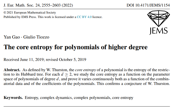 近日,国际知名学术期刊“Journal of the European Mathematical Society”(欧洲数学会杂志)正式发表了vsport数学与统计学院副教授高延与多伦多大学Tiozzo教授合作的学术论文“The core entropy for polynomials of higher degree”。