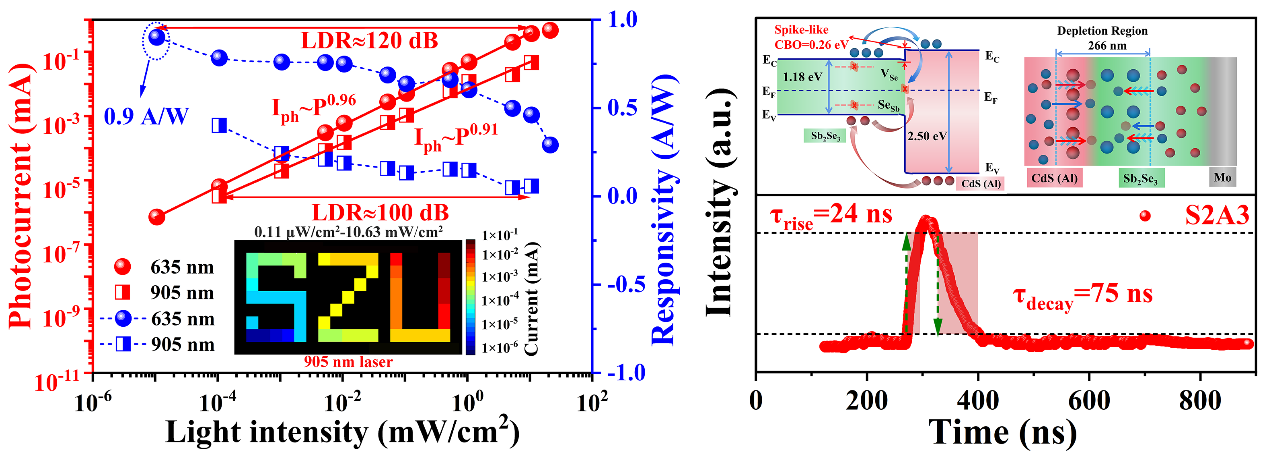 Sb2Se3在新型高效低成本薄膜光电探测器研究领域引起广泛关注,主要由于以下优势:(1)一维晶体结构,探测器像素之间无横向串扰:Sb2Se3具有一维晶体结构(c方向为共价键,a和b方向为弱范德华力相互作用),强各向异性促使载流子沿着[Sb4Sb6]n链有效地运输,在链间则以hopping形式传输,利于消除探测器横向串扰;(2)缺陷存在互补偿:Sb2Se3天然存在VSb、VSe等点缺陷,对应的缺陷深度为0.4~0.7 eV,有望利用缺陷吸光进行非本征探测将探测波段拓宽至2000 nm;(3)Sb2Se3具有较低的结晶温度(133°C),相应探测器与CMOS工艺高度兼容。本文采用溅射硒化法制备了[hk1]择优取向生长的Sb2Se3薄膜,构建优异的Sb2Se3/CdS平面异质结光电探测器。为了进一步提升器件性能,利用Al3+掺杂CdS缓冲层,降低界面缺陷密度和体缺陷密度、增加耗尽层宽度以及优化p-n结界面能带排列,进一步降低器件的载流子复合,提升载流子输运能力。基于此,该薄膜光电探测器能够实现无外加偏压自驱动工作,响应度提升至0.9 A/W、探测度达到4.78×1012Jones、开关比高达106、线性动态范围高达120 dB、响应速度首次达到ns量级(响应时间24 ns和恢复时间75 ns)。相关研究成果发表在InfoMat (2023) e12400上(影响因子:24.798),陈烁为论文第一作者,其指导的硕士研究生付毅为第二作者,梁广兴为通讯作者,vsport为唯一通讯单位。
