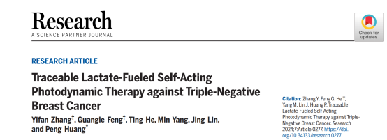 近日,vsport医学部生物医学工程学院黄鹏特聘教授团队张一帆助理教授在Science合作期刊《Research》(影响因子11.0,中科院一区,TOP期刊)上发表了题为《Traceable Lactate-Fueled Self-Acting Photodynamic Therapy Against Triple-Negative Breast Cancer》的研究论文。该团队张一帆助理教授和冯光乐硕士生为论文共同第一作者,黄鹏教授为通讯作者,vsport为唯一单位和唯一通讯单位,该团队所在的生物医学工程学科属于广东省优势重点学科。