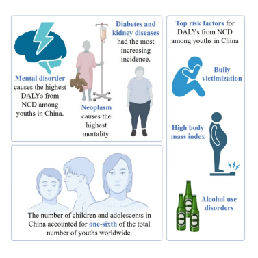 近年,我国儿童和青少年的传染病死亡率下降了68.7%,与此同时我国经历了快速的社会转型、城市化和全球化,导致青少年中广泛存在的慢性病风险因素,例如缺乏运动、久坐等不良生活方式和智能手机成瘾等。预计我国有15.6%的学龄前儿童和31.8%的学龄儿童超重或肥胖,在2030年或将导致610亿美元的医疗费用。本研究通过大数据分析及模型构建首次揭示了在1990-2019年期间我国儿童及青少年人群中慢性疾病负担变化趋势。研究发现(1)心理行为异常在我国儿童(10-14岁)、青少年(15-19岁)、青年(20-24岁)人群中均造成了最高的伤残调整寿命年(DALYs);(2)非传染性疾病中造成儿童及青少年人群死亡率最高的是肿瘤,特别是白血病;(3)欺凌行为是儿童及青少年人群心理行为异常DALYs的主要危险因素;(4)高BMI指数、酒精滥用等是肿瘤DALYs的主要危险因素。对于慢性病的控制,需要早期干预,特别是针对其在年轻人群中的早期发病。本研究不仅总结了我国儿童和青少年慢性疾病负担及变化趋势,更为制定有效干预政策提供了科学参考。