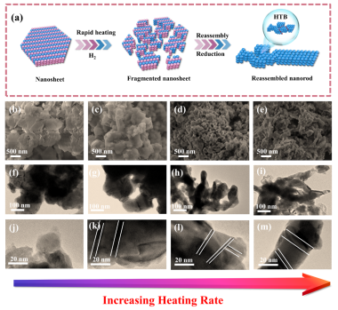 在金属催化剂中构建孪晶界,已经成为提升其电催化性能的有效手段之一。目前孪晶的构建主要依赖于表面活性剂辅助的液相合成法,但是大多数表面活性剂存在长烷基链,导致纳米晶体放入表面被表面活性剂所包裹,极大地阻碍了活性位点的暴露以及电催化过程中的电荷转移。因此,我们提出了一种无表面活性剂的孪晶催化材料合成策略,利用氢气气氛下超薄氧化铜纳米片的快速升温还原,合成具有多级孪晶界的铜基催化材料。通过原位透射电镜追踪了孪晶的形成过程,发现快速的升温以及超薄氧化物纳米片的亚稳态特性,可以使氧化物铜在焙烧过程中发生不同方向的碎裂形成大量的晶核,从而通过晶核的碰撞以及合并诱导非常规的晶体生长方式,最终形成多级孪晶结构。将多级孪晶铜用于硝酸根还原反应,发现其催化活性远高于单取向的孪晶以及无孪晶的铜基催化材料。通过一系列的电化学以及理论计算,作者发现多级孪晶的结构会产生压缩应变,从而形成孪晶与压缩应变的协同效应,降低硝酸根还原为氨的反应能垒并抑制副产物生成。