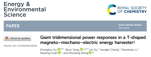 2024年1月23日,能源领域国际顶级期刊Energy & Environmental Science 在线报道了董蜀湘教授团队在微能源采集研究领域取得的重要进展。论文题目为:Giant tridimensional power responses in a T-shaped magneto–mechano–electric energy harvester (DOI: 10.1039/d3ee03634k)。在前期工作中,团队提出了压电超材料的协同模态设计方法(Science Advances, 2019, eaax1782),受此启发,本工作设计了独特的弯-扭协同工作模态,仅在单一的T型悬臂梁结构能量采集器中实现了三维正交磁场的高效响应和磁场能量采集。