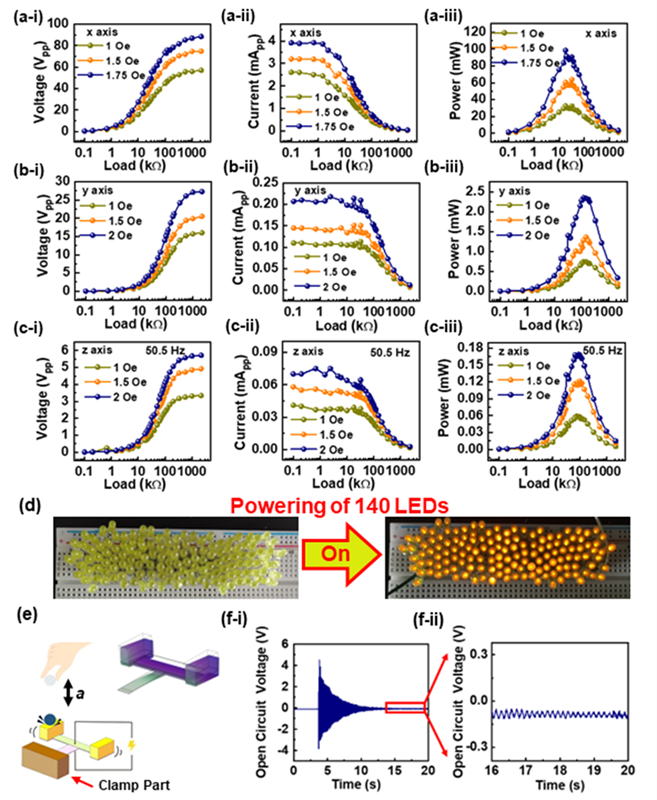 本文提出的基于弯扭协同模态新概念的T型结构能量采集器具备三维正交方向的磁-机-电耦合能力、优异的功率输出性能以及未来在物联网系统自供能模块中的应用潜力,并且将对未来众多基于磁机电耦合原理的器件(如磁场传感器、机械天线等)设计都具有指导和启发意义。