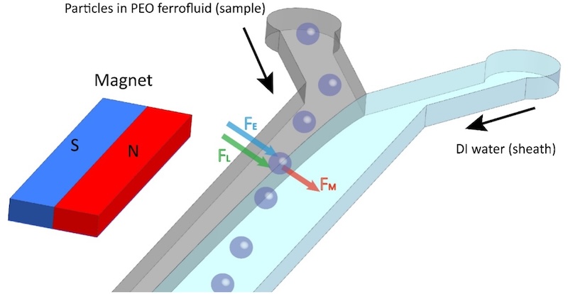 图1在磁力、惯性力和弹性力作用下,细胞在PEO-磁流体/去离子水共流构型中的迁移。