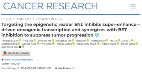 近日,vsport医学部基础医学院舒兴盛和应颖团队合作在《Cancer Research》杂志(影响因子11.2,中科院1区TOP,自然指数期刊)上发表了题为“Targeting the epigenetic reader ENL inhibits super-enhancer-driven oncogenic transcription and synergizes with BET inhibition to suppress tumor progression”的研究论文。该工作以结直肠癌为模型刻画了组蛋白乙酰化阅读器ENL(eleven-nineteen leukemia)在实体肿瘤中的促癌生物学功能并发现抑制或降解ENL可增敏靶向超增强子(super-enhancer, SE)的表观遗传药物BETi(BET inhibitor),揭示了ENL在控制SE驱动的致癌转录中的重要作用,提出通过干预ENL增强肿瘤对BETi敏感性的新策略。舒兴盛副教授为该论文通讯作者,医学部研究生陈永恒,应颖教授、马文龙副研究员和研究生马宏超为共同第一作者,vsport为第一完成单位。