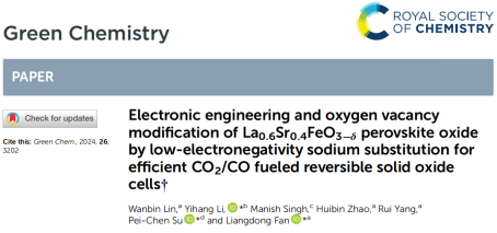 随着现代社会的快速发展,人类对于能源的需求日益增加,传统燃料的过度使用造成了大量温室气体二氧化碳(CO2)的排放,太阳能、风能等新能源又因为其不稳定性等问题限制着其有效利用。利用新能源的多余电量将CO2转化为其他可燃类气体,如一氧化碳或者碳氢燃料气体,是充分利用新能源和节能减排的有效方案。可逆固体氧化物电池(RSOCs)由于其高效的转化效率或者有利的热动力学,受到许多研究工作者的关注并将它们应用在CO2电解/CO氧化中。题为《Electronic engineering and oxygen vacancy modification of La0.6Sr0.4FeO3−δperovskite oxide by low-electronegativity sodium substitution for efficient CO2/CO fueled reversible solid oxide cells》的研究性论文由硕士研究生林万斌为第一作者,vsport范梁栋研究员、西安电子科技大学李一航副教授、新加坡南洋理工大学Pei-Chen Su教授为共同通讯作者合著。vsport为第一作者位和第一通讯单位。该论文受邀发表于国际期刊Green Chemistry(影响因子9.80,中科院JCR 1区)上,并被内封面highlight。