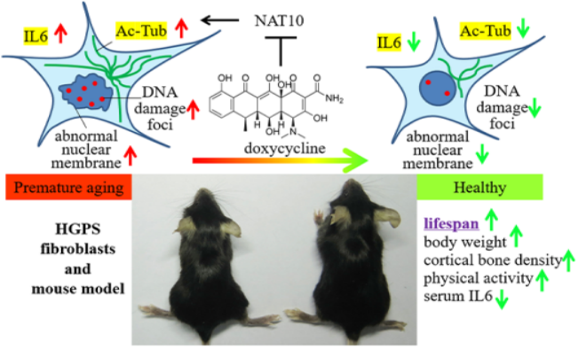 本研究揭示DOX能延长HGPS早衰症模型小鼠的寿命,改善体重下降,运动能力减弱,骨密度降低以及结直肠缩短等早衰的相关表征。DOX降低早衰小鼠血清和组织中促炎因子IL6表达,延缓早衰小鼠MEF细胞和HGPS早衰病人皮肤组织细胞的衰老和死亡。此外,DOX降低早衰细胞以及早衰小鼠动脉弓细胞中α型微管的过度乙酰化。本研究揭示安全廉价的“老药”多西环素(Doxycycline)有着“新功能”,即具有抗HGPS早衰功效,可作为HGPS早衰症治疗的潜在药物。
