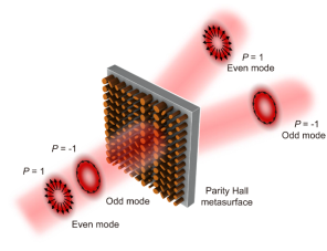 图1 基于超表面实现的矢量模式宇称霍尔效应示意图。通过形状双折射超表面,将CVB的偶宇称(P = 1)和奇宇称(P = -1)模式分离到不同的方向。