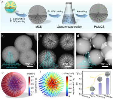 在本工作中,何传新教授团队采用优化的介孔碳载体来负载Pd纳米颗粒(Pd/MCS),实现了高达95%的H2O2选择性,并在流动池设备中H2O2产率达到15.77 mol gcatalyst-1h-1。有限元模拟和实验结果表明,介孔碳载体促进了O2富集和局部pH值的升高,为中性条件下的2e-ORR创造了有利的反应微环境。理论计算和表征结果表明,Pd纳米粒子与碳载体之间的相互作用优化了碳边缘对*OOH中间体的吸附能,确保了催化反应沿着高活性和高选择性的两电子途径进行。该工作为中性H2O2溶液的高效电合成催化剂提供了新的见解,强调了载体工程在构建有利的微环境和协同活性位点方面的作用。