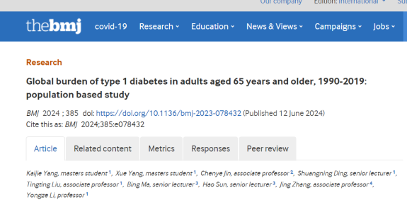 医学部助理教授张晶在BMJ发表全球老年人群Ⅰ型糖尿病负担变化研究成果
