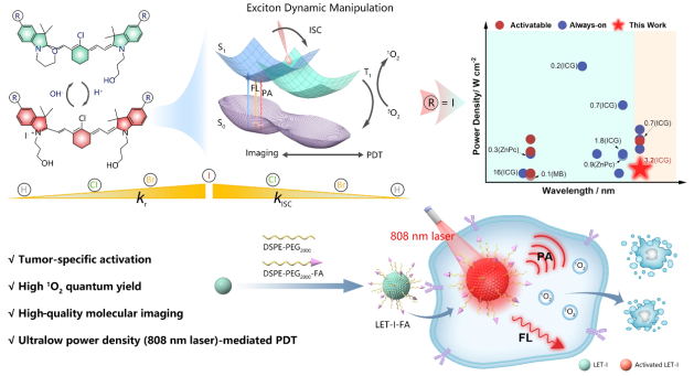 2024年6月,vsport医学部生物医学工程学院林静教授团队在国际顶级学术期刊Angew. Chem. Int. Ed.(影响因子16.6,中科院一区,TOP期刊)上发表了题为《Dissecting Exciton Dynamics in pH-Activatable Long-Wavelength Photosensitizers for Traceable Photodynamic Therapy》的研究论文。医学部刘宇茸副研究员与硕士研究生张景(现为东京大学在读博士)为第一作者,林静教授为唯一通讯作者,vsport为唯一完成单位。该团队开发了一类pH可激活的长波长花菁光敏剂分子用于可视化光动力治疗(PDT)。这类光敏剂能够被肿瘤酸性微环境特异激活,从而减少正常组织的光毒副作用,同时开启NIR荧光(FL)和光声(PA)双模态成像。通过引入不同的卤素调控分子的激子动力学过程,提高光电子的系间窜越(ISC)效率,从而提高单线态氧的量子产率,实现肿瘤高效可视化PDT。