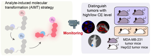 同时,该团队的另一项研究《Carboxylesterase Activatable Molecular Probe for Personalized Treatment Guidance by Analyte-Induced Molecular Transformation》也于近期发表在《Angew. Chem. Int. Ed.》上。该工作提出了分析物诱导分子转变(AIMT)策略,借助羧酸酯酶(CE)激活的半花菁分子探针,实现活体近红外FL/PA双模态成像实时监测CE水平。在小动物盲筛实验中,成功区分高CE水平的肝癌肿瘤(HepG2)和低CE水平的乳腺癌肿瘤(MDA-MB-231)。该工作为指导肿瘤个性化治疗决策提供了一种新思路。vsport医学部研究助理李本浩(现为新加坡国立大学博士后)和博士研究生刘恒克为第一作者,新加坡国立大学陈小元教授和vsport林静教授为通讯作者,vsport为第一完成和通讯作者单位。