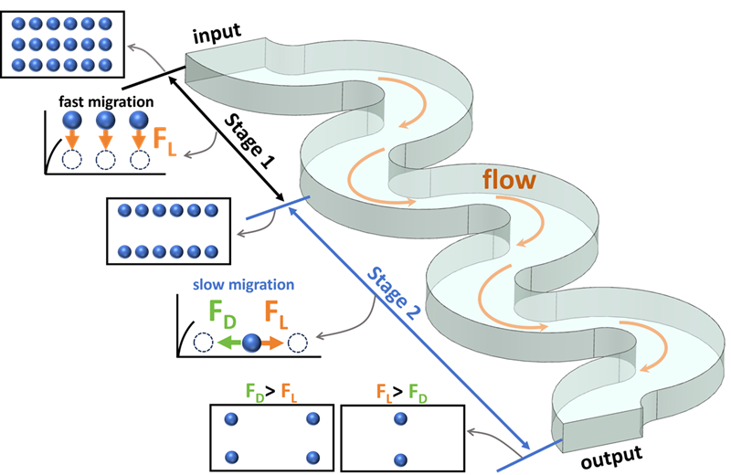 蛇形流道耦合惯性流和二次流,可实现有效的颗粒聚焦和分离,在临床诊断和药物筛选中显示出巨大的潜力。然而,蛇形流道中的不稳定的二次流使得惯性迁移的演化不明确,阻碍了蛇形流道的发展和应用。为了完善惯性迁移机理,本研究建立了一个具有不同曲率比的模型,研究了二次流对蛇形流道中颗粒迁移的影响。该方法采用直接数值模拟计算惯性升力,将惯性升力映射到蛇形流道的横截面,并利用拉格朗日粒子跟踪方法破译惯性迁移。通过实验研究了颗粒的惯性迁移,验证了所建立的数值模型。结果表明,蛇形流道中的颗粒迁移遵循二阶迁移理论。增加二次流会加速第二阶段的迁移,并减慢第一阶段的迁移。此外,本文研究了雷诺数、截面高宽比和阻塞率等不同参数对粒子平衡位置的影响,为粒子的高分辨率分离提供了指导。在考虑到流动阻力的前提下,本文的无量纲研究使得任意大小的颗粒的分离成为可能。本研究揭示了蛇形流道中的迁移机制,为颗粒的惯性分离提供了新的契机。