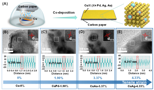 (5) 利用简单的双金属共蒸镀策略,成功将少量异质金属原子(Pd、Au、Ag)引入铜晶格中。基于异质原子与Cu原子之间的原子半径差异,成功构建了不同晶格拉伸应变程度的Cu基催化剂,有效改变了活性位点的电子结构,影响关键反应中间体的吸附行为,从而提升CO2电还原的多碳产物的选择性。该成果以“Heteroatom-induced tensile strain in Copper lattice boosts CO2electroreduction toward multi-carbon products”为题,发表在Carbon Energy(IF=19.5),硕士研究生翟志扬为第一作者。