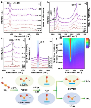 (2)CO2电还原主要发生在三相界面,而界面性质可以直接影响反应路径。虽然Cu基材料能够产生大量的醇类和烃类,但很难精确调控反应界面以获得特定的目标产物。通过离子液体(例如[Bmim][PF6])的引入,成功调控了Cu表面的界面性质,从而改变了CO2电还原的反应路径。实验结果表明,Cu基催化剂的主要产物可以从C2H4(法拉第效率,FE为71.1%)转换为CH4(FE为67.2%)。该成果以“Ionic Liquid-Induced Product Switching in CO2Electroreduction on Copper Reaction Interface”为题,发表在Advanced Functional Materials(IF=18.5),博士后蔡慧珠为第一作者。
