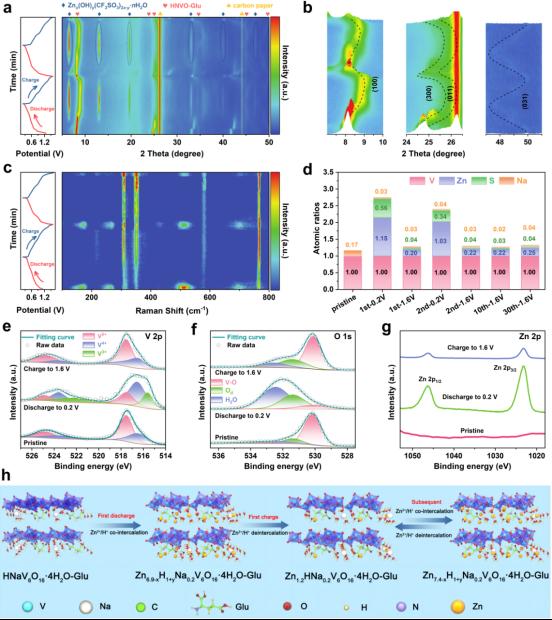 在本研究中,研究团队通过客体材料介导的NVO合成策略,利用谷氨酸(Glu)诱导质子取代Na,实现Na2V6O16·3H2O(NVO)的晶体转变,从而探索出一种有机-无机混合正极HNaV6O16·4H2O-Glu(HNVO-Glu)。其中,通过Glu可以将H引入NVO框架中,诱导形成结构更稳定的单斜HNaV6O16·4H2O相,防止结构相变和V6O16层状结构材料坍塌;同时Glu作为支柱扩大层间距,提升Zn2+扩散动力学;此外,Glu表面的极性基团削弱了Zn2+与宿主材料之间的静电作用,进一步提高了Zn2+迁移速率;理论计算表明Glu的引入可以将原始的p型半导体转化为n型半导体结构,提高了HNVO正极的导电性。该研究为未来合理设计具有有机-无机杂化结构的先进水系锌电正极提供了潜在的见解。