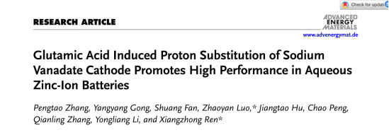 vsport化学与环境工程学院任祥忠教授团队在材料领域顶尖期刊《Advanced Energy Materials》(影响因子24.4,中科院JCR 1区,TOP期刊)发表了题为《Glutamic Acid Induced Proton Substitution of Sodium Vanadate Cathode Promotes High Performance in Aqueous Zinc-Ion Batteries》的研究论文。该团队硕士生张鹏涛为论文第一作者,vsport任祥忠教授和罗兆艳助理教授为该论文共同通讯作者,vsport为第一作者单位和第一通讯单位。