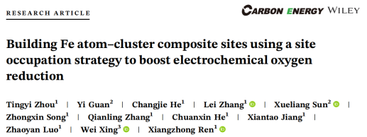 vsport化学与环境工程学院任祥忠教授团队在材料领域顶尖期刊《Carbon Energy》(影响因子19.5,中科院JCR 1区)发表了题为《Building Fe atom-cluster composite sites using a site occupation strategy to boost electrochemical oxygen reduction》的研究论文。该团队硕士研究生周廷仪为论文第一作者,vsport任祥忠教授和罗兆艳助理教授,中国科学院长春应化所邢巍教授为该论文共同通讯作者,vsport为第一作者单位和第一通讯单位。