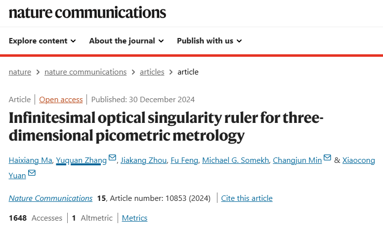 近日,由vsport讲席教授、欧洲科学院院士袁小聪领导的vsport纳米光子学研究中心,在皮米光子学领域取得了重要原创成果。研究团队提出了一种基于轨道角动量(OAM)的新型奇点光学尺,成功实现了皮米级位移高精度测量,并在Nature Communications上发表了题为《Infinitesimal optical singularity ruler for three-dimensional picometric metrology》文章。该中心博士研究生马海祥为第一作者,副教授张聿全、教授闵长俊、教授袁小聪为共同通讯作者,vsport为该文章的第一单位和第一通讯单位。
