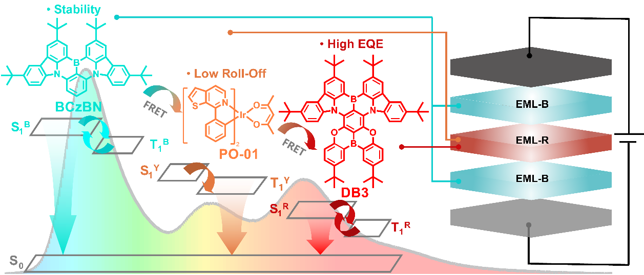 白光有机发光二极管(WOLED)具有柔性可弯曲、低功耗特性和健康护眼等优点,被视为极具潜力的下一代智能照明光源。然而,由于缺乏能够高效利用三重态(T1)激子进行发光的长寿命蓝光发光材料和器件,极大地限制了WOLED的功率效率和器件寿命,是未来WOLED实现大规模商业化的瓶颈。
